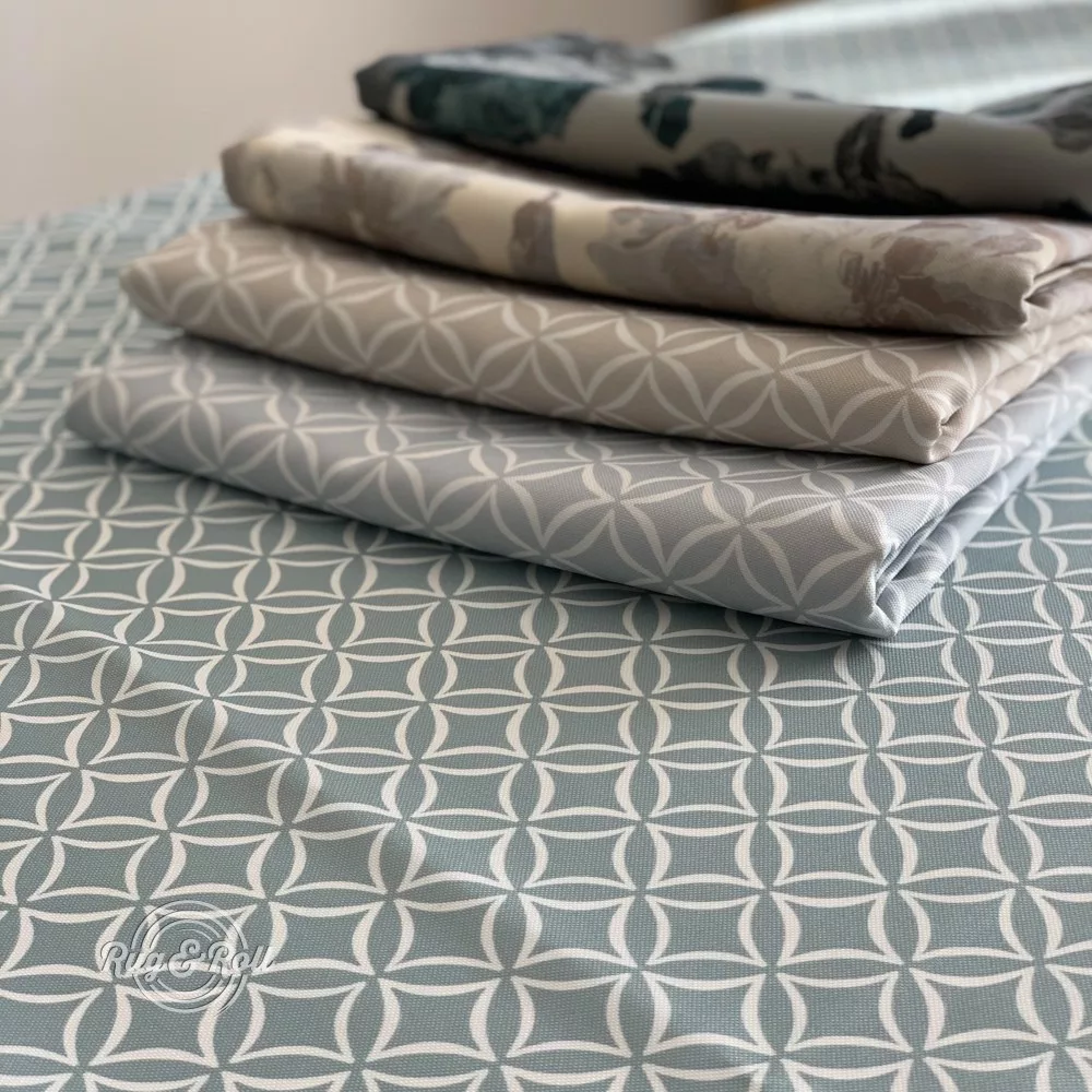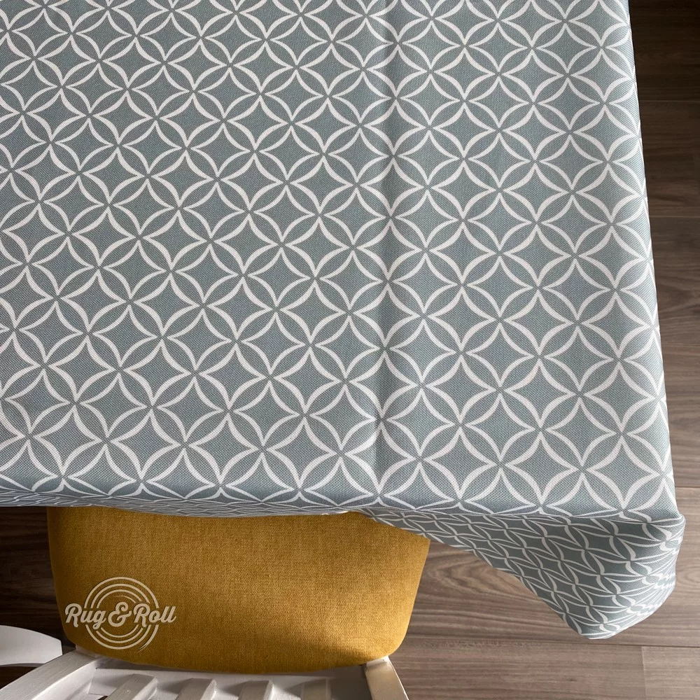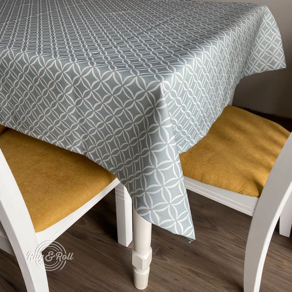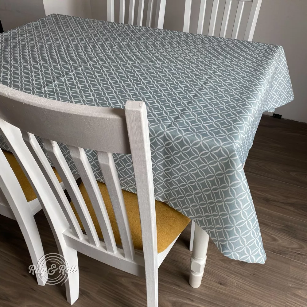 Halványkék geometriai mintás asztalterítő szennytaszító és gyűrődésmentes felülettel. Könnyedén tisztán tartható, gyorsan szárad. Se folt, se vasalás!
