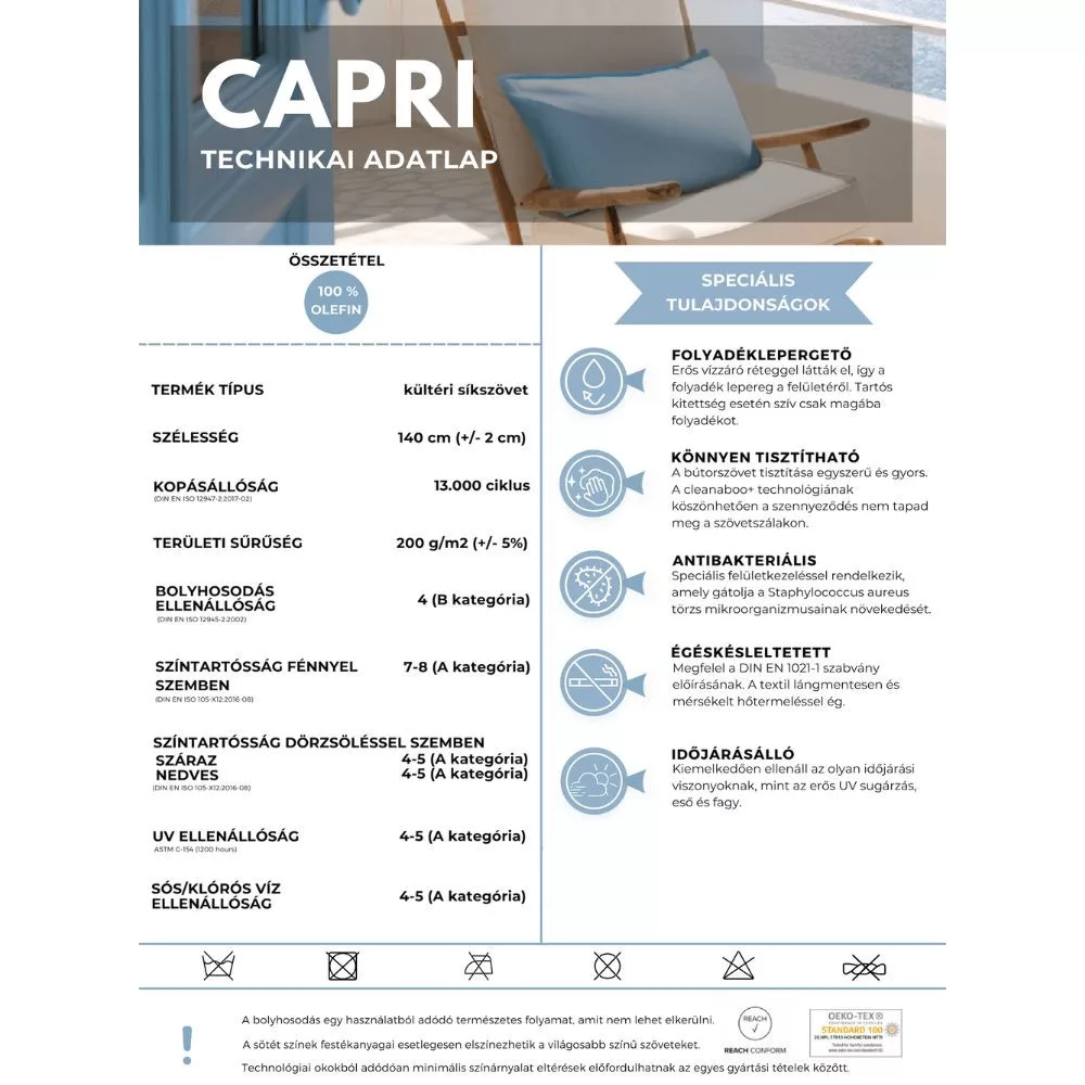 Minőségi időjárásálló kültéri szövet szürkésbarna színben, folyadéklepergető és az antibakteriális réteggel. A cleanaboo+ technológiának köszenhetően a szennyeződések nem tapadnak meg a szövet szálain, így rendkívül könnyen tisztán tartható.