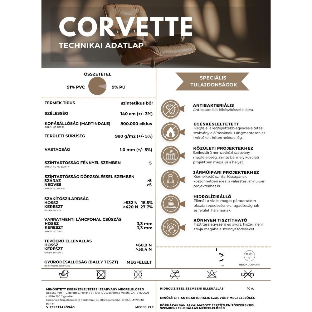 Corvette Ash, hamuszürke, extrém magas kopásállóságú kiváló fénytartósságú, égéskésleltetett, antibakteriális, vízálló és könnyen tisztítható műbőr szövet.