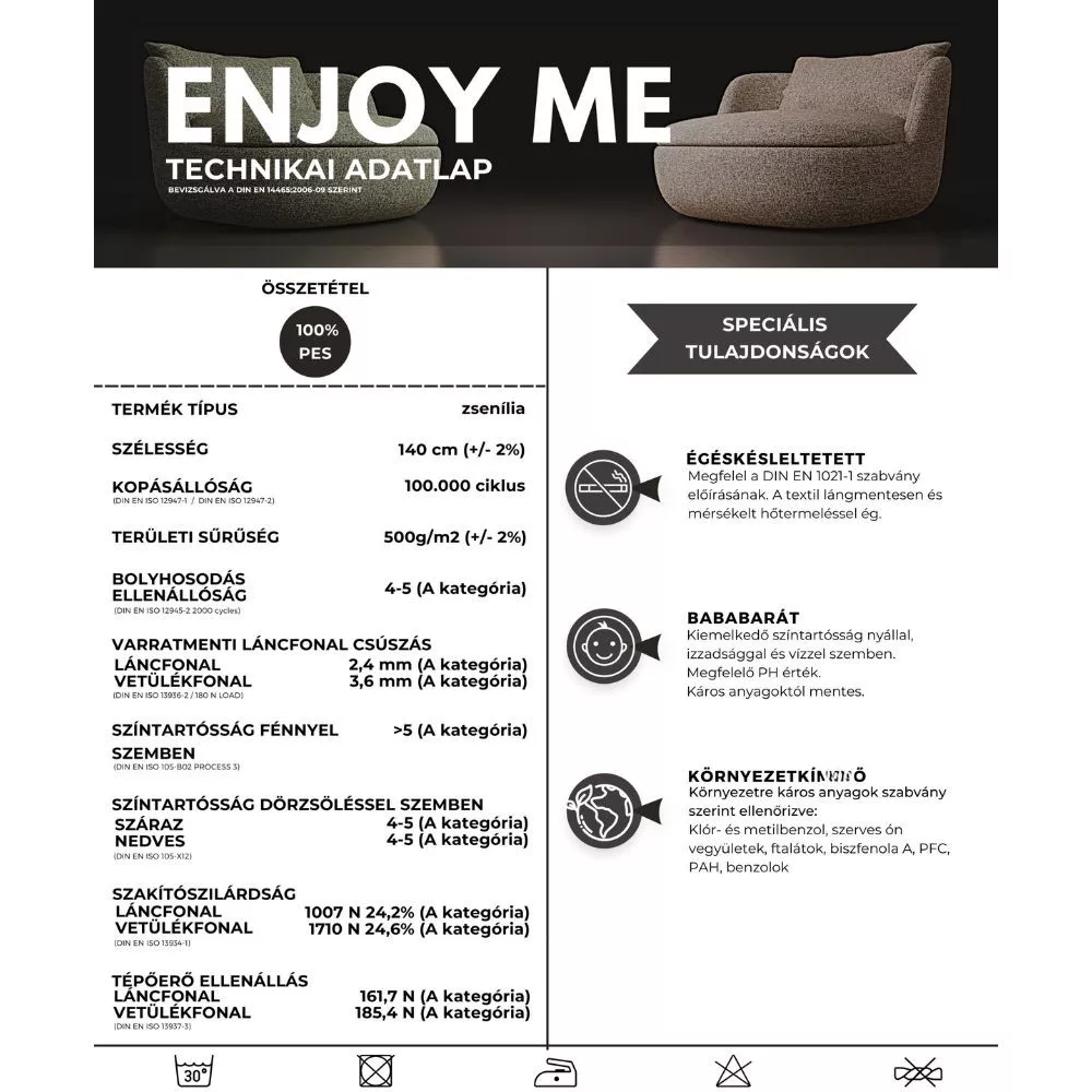 Prémium minőségű, zseníliás szövésű, égéskésleltetett, rendkívül tartós bútorszövet 17 ragyogó színben. A zsenília 3 dimenziós kötött hatása a legújabb Dobd fel régi vagy megunt bútoraidat minőségi bútorszöveteinkkel!