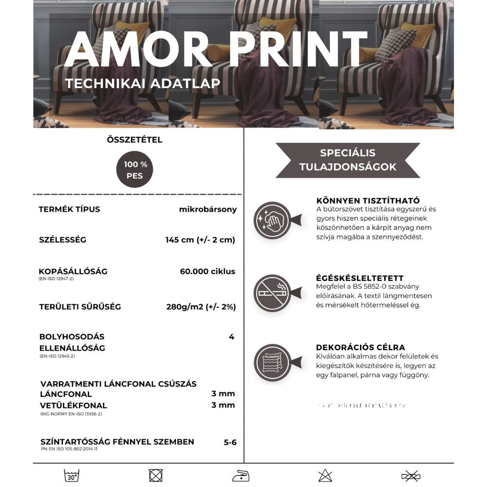 Prémium minőségű, bársonyos felületű, modern bútorszövet egyedi grafikával.