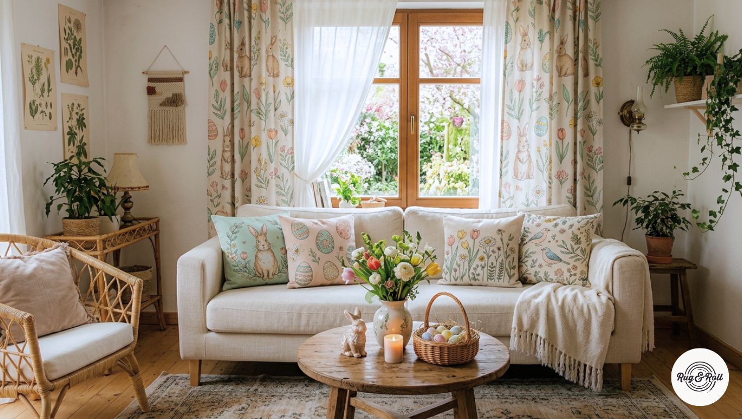 Egy világos, semleges színekkel felöltöztetett nappaliban a pasztell árnyalatok – mint a púderrózsaszín, a menta vagy a halványsárga – varázslatos összhangot teremtenek. Egy boho-vintage stílusú enteriőrbe tökéletesen illenek a finom, virágos minták vagy a vintage stílusú húsvéti nyuszik és hímes tojások.